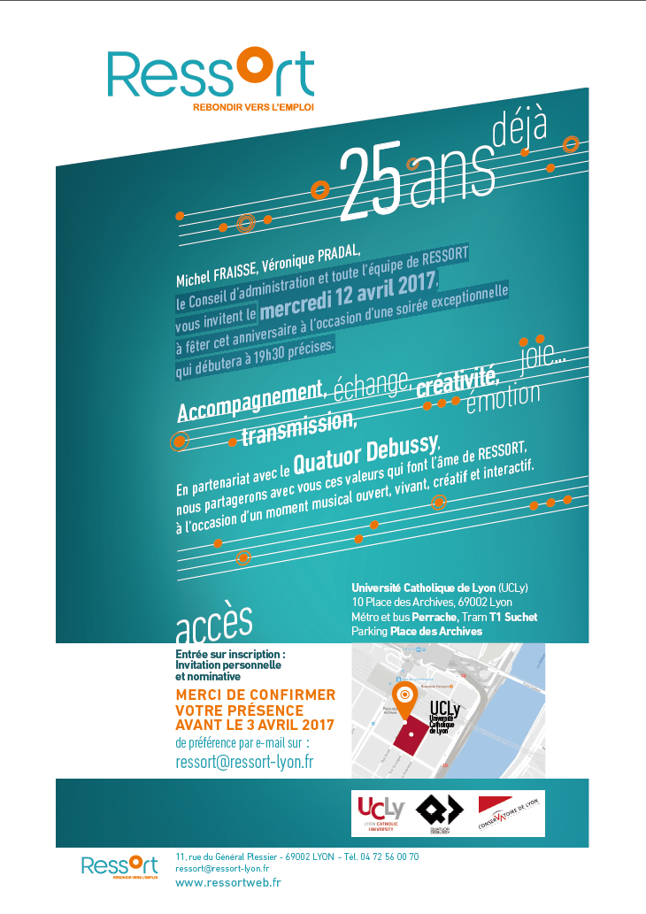 Le Conseil d’administration et toute l’équipe de RESSORTvous invitent le mercredi 12 avril 2017,à fêter cet anniversaire à l’occasion d’une soirée exceptionnellequi débutera à 19h30 précises.